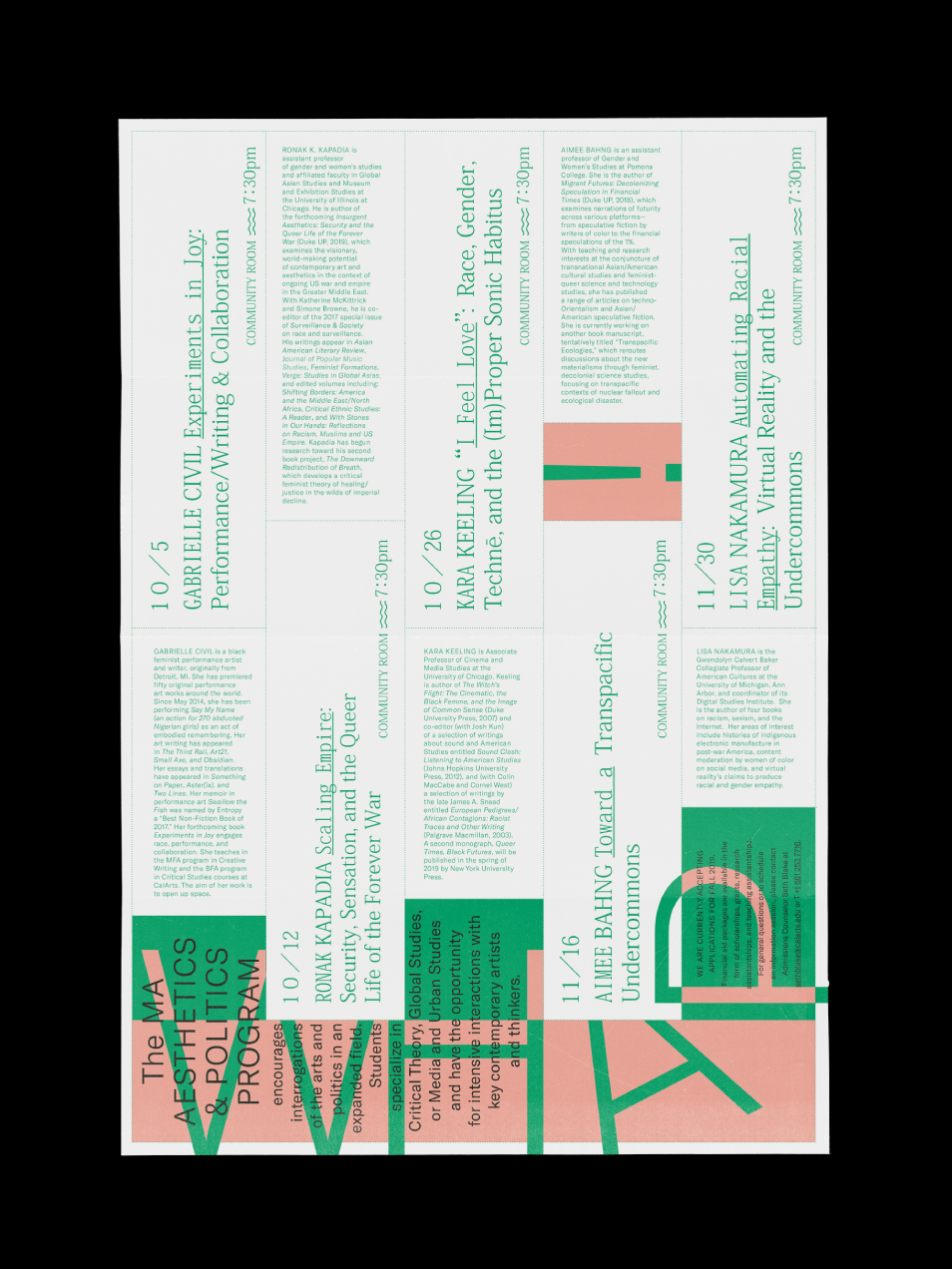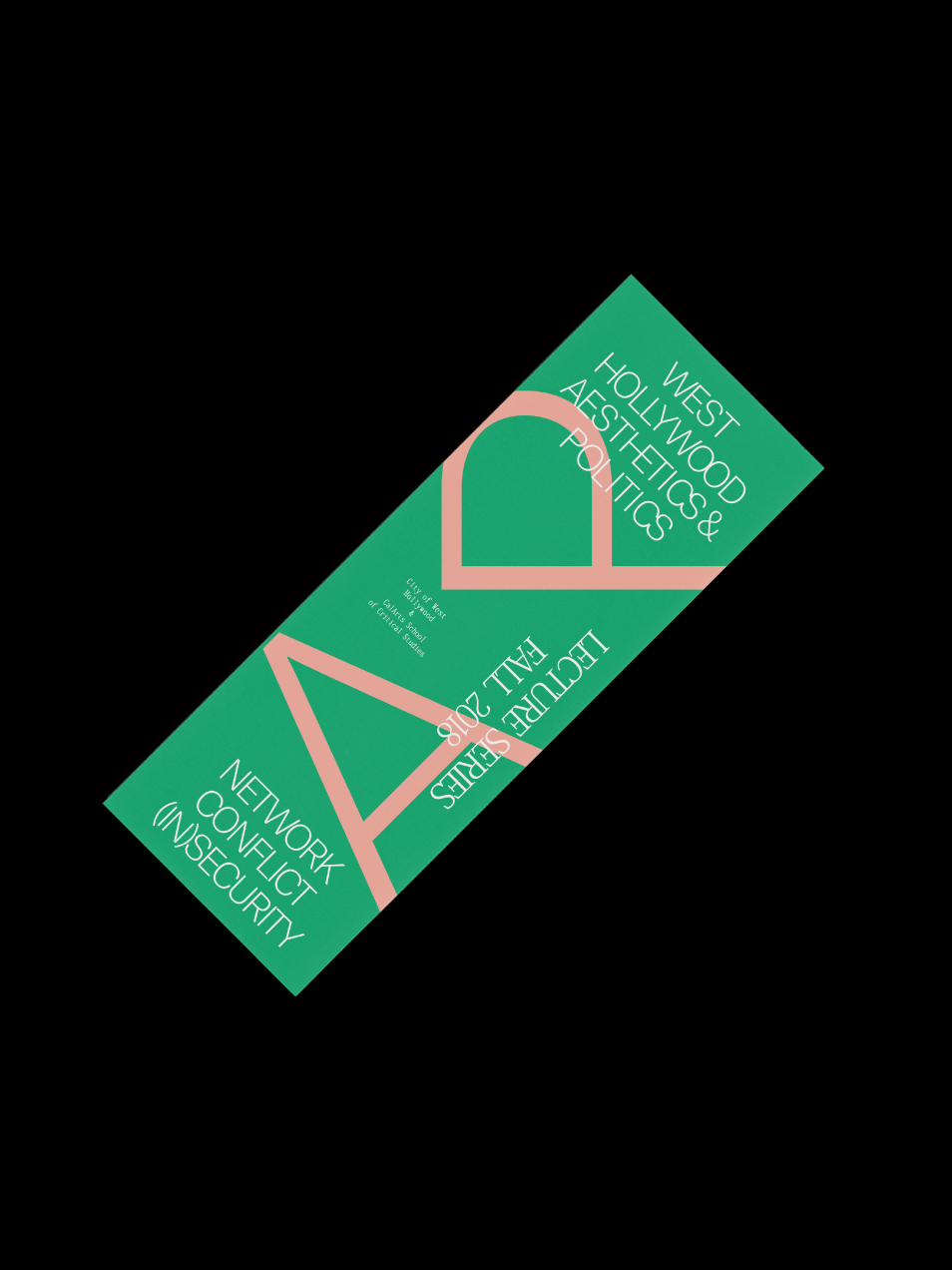 Poster design for the West Hollywood Aesthetics and Politics (WHAP!) lecture series, hosted by the CalArts School of Critical Studies. Posters are double-sided and also function as brochures.